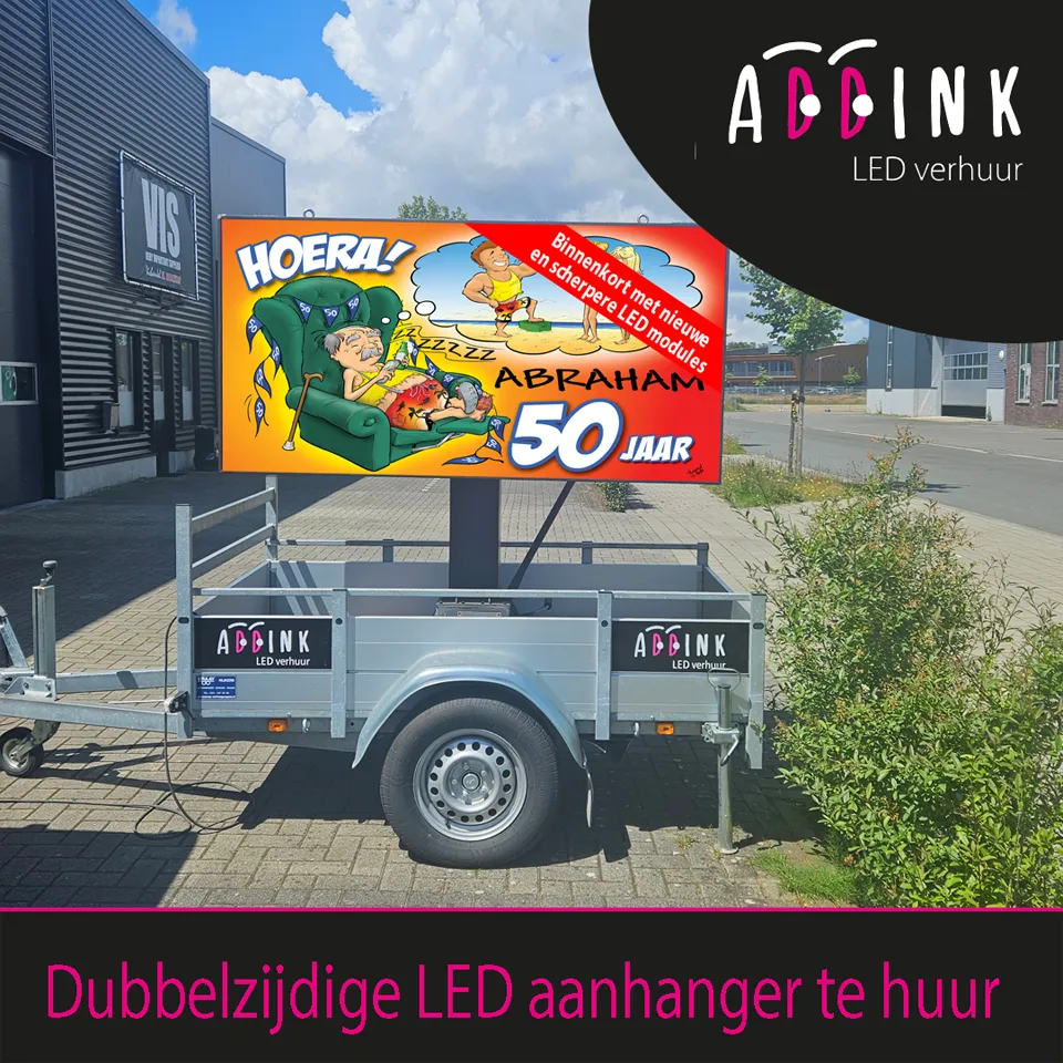 Voor Abraham, Sarah, jubilarissen, 25 jaar getrouwd, enzovoort. Wij hebben een prachtige dubbelzijdige LED aanhanger te huur, die héél mooi op de oprit past bij dergelijke festiviteiten. Eens een keer héél wat anders dan een standaard spandoek of opblaaspop voor de deur! En het mooie van deze LED aanhanger is: Er kunnen ook video’s op!!! Dus als je toevallig nog wat grappige beelden van “het slachtoffer” hebt, kunnen die gewoon getoond worden.